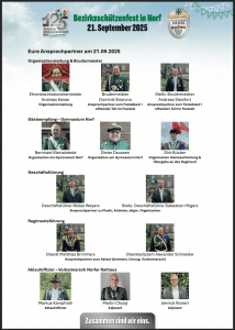 am 21.09.2025 feiern wir in Norf und Derikum unser 125. jähriges Jubiläum, das 75 jährige Jubiläum des Bezirksverbands Neuss sowie das Bezirksschützenfest.