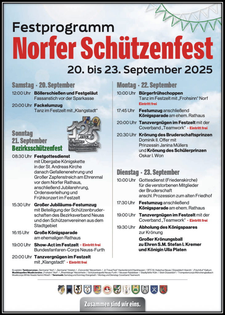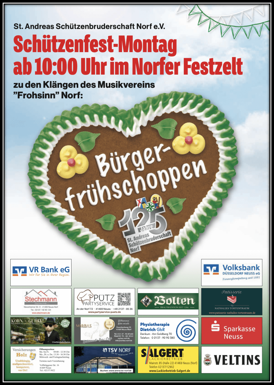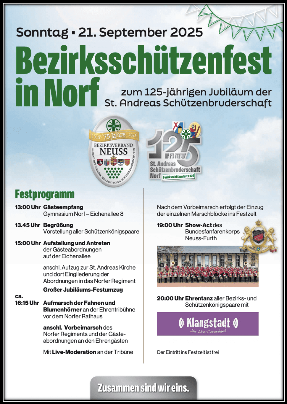 Zusammen mit allen 17 Bruderschaften aus dem Bezirksverband Neuss und einer Vielzahl an Heimat- und Bürger-Schützen-Vereinen feiern wir Sonntag, den 21. September das Bezirksschützenfest mit vielen Highlights.